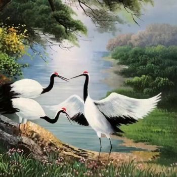首页 --> 艺术商城 --> 动物油画 --> 仙鹤 --> 字画美官方旗舰店 --> 适合玄关的新中式纯手绘油画仙鹤延年迎客松旭日东升风景油画