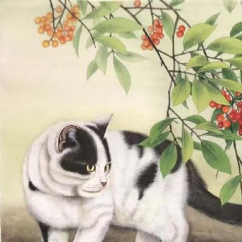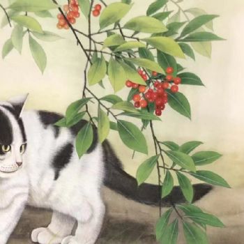 首页 --> 艺术商城 --> 国画动物画 --> --> 字画美官方旗舰店 --> 樱桃树下的小猫动物手绘国画工笔国画实木画框