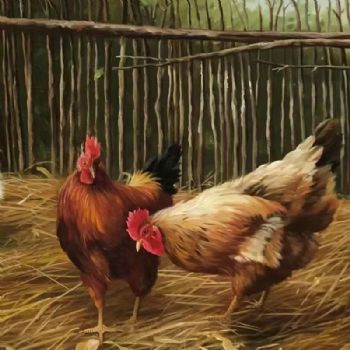 纯手绘动物公鸡母鸡一家亲油画