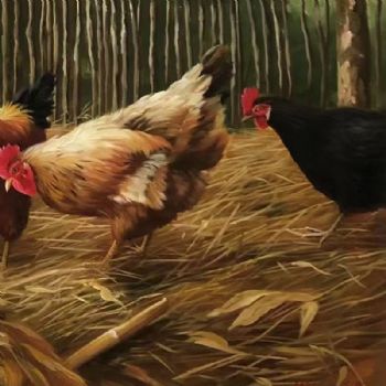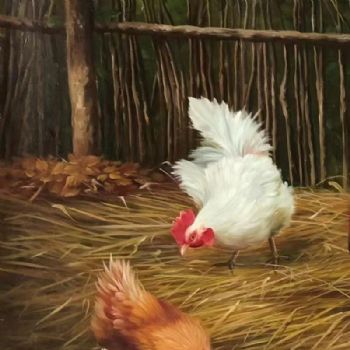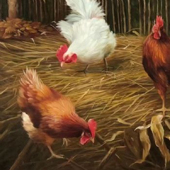 • 写实动物场景油画朝鲜油画纯手绘动物公鸡母鸡一家亲油画