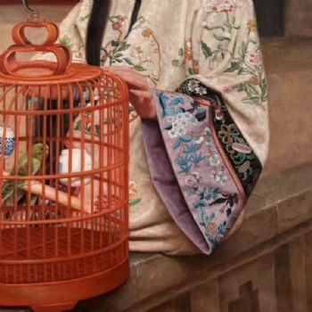 • 中式古装人物油画纯手绘美女鸟笼人物油画