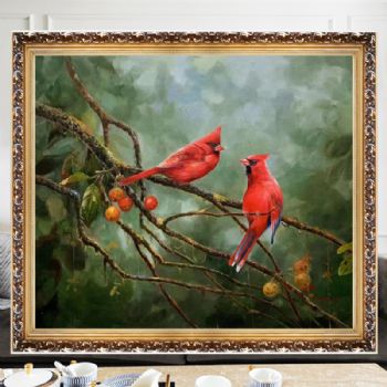 • 春暖花开喜上枝头纯手绘朝鲜油画餐厅客厅动物油画挂画