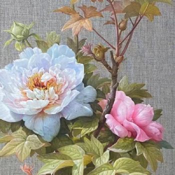 • 新中式牡丹写实油画纯手绘作品花开富贵实木框