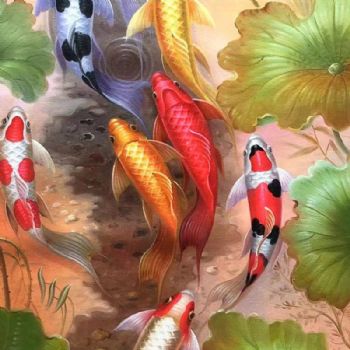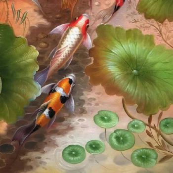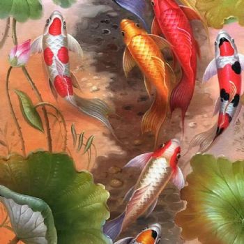 • 新中式锦鲤九鱼图油画作品