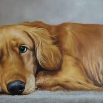 • 手绘动物油画写实动物油画金毛写实油画实木外框