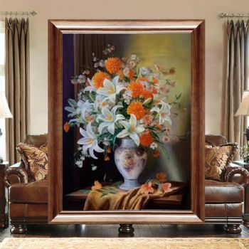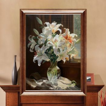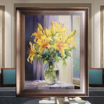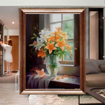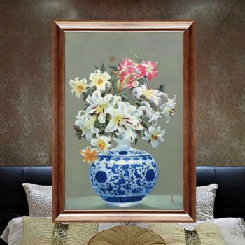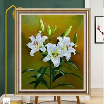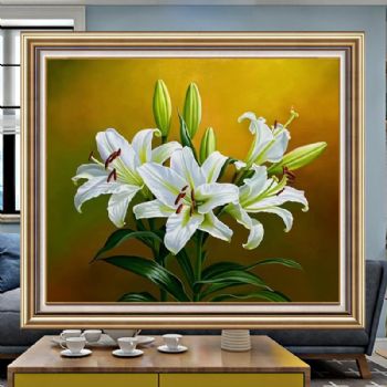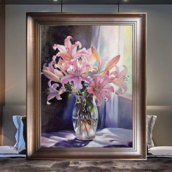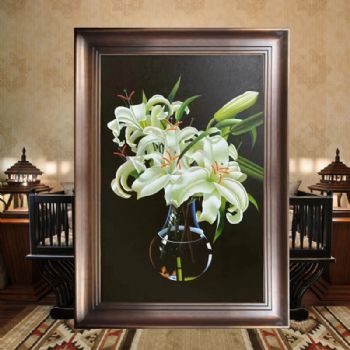 • 百年好合新中式写实花卉油画百合花卧室挂画PS环保外框