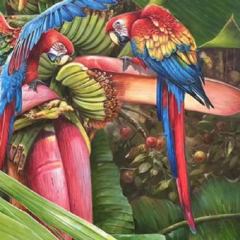 首页 --> 艺术商城 --> 动物油画 --> 鹦鹉 --> 字画美官方旗舰店 --> 香蕉树上的金钢鹦鹉纯手绘写实动物油画实木外框