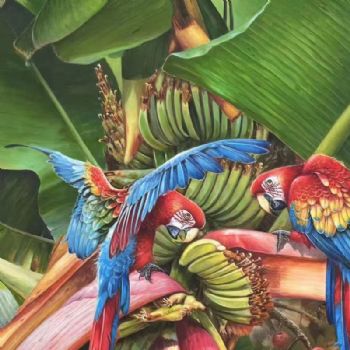 • 香蕉树上的金钢鹦鹉纯手绘写实动物油画实木外框