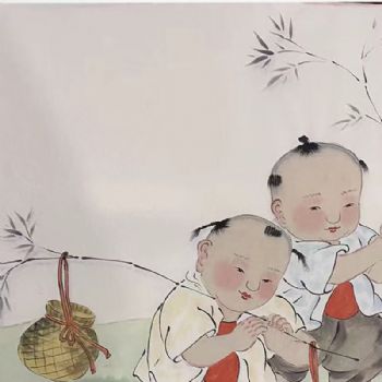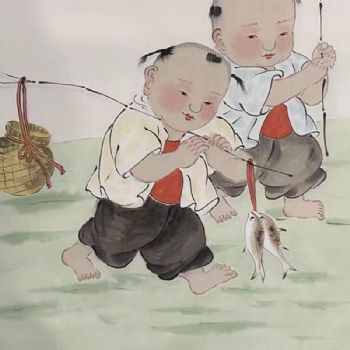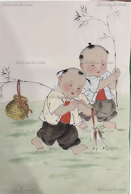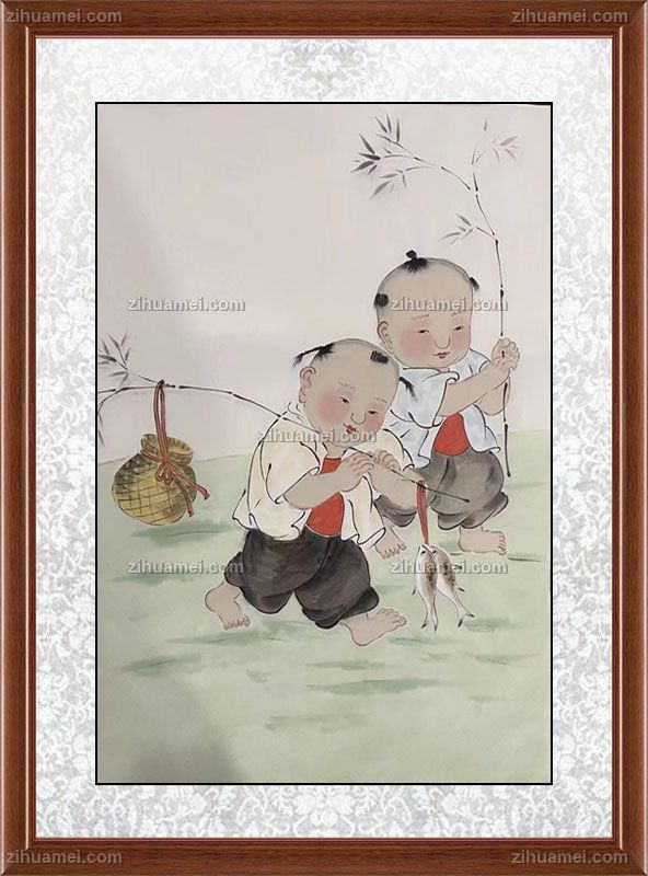 • 福娃捕鱼回图四尺三开人物人物国画纯手绘工笔人物画实木外框