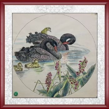• 写实工笔黑天鹅一家亲图精品国画花鸟国画手绘水墨国画餐厅客厅挂画四尺斗方