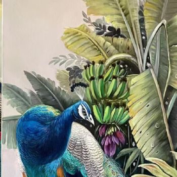 • 石头芭蕉上孔雀图精品手绘动物油画玄关写实孔雀幸福吉祥实木外框
