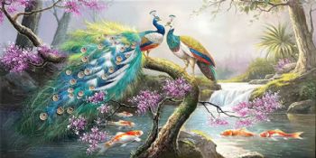 • 横幅精品工笔写实孔雀图客厅大厅手绘动物油画实木外框