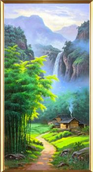 • 瀑布流水人家竹林风景油画纯手绘油画实木画框