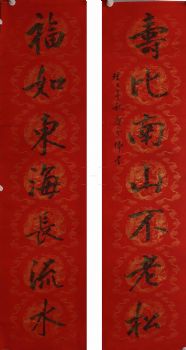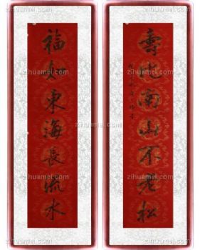 • Tang Dengwei's hand-painted calligraphy works, Chinese painting couplet, a pair of calligraphy elegant red brown solid wood frame