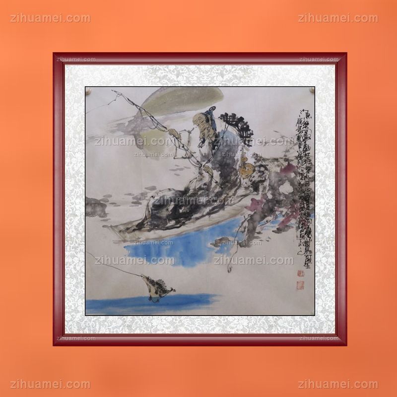 • Hand painted hand-painted figure painting old man fishing elegant red brown solid wood frame