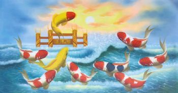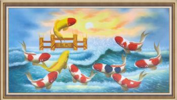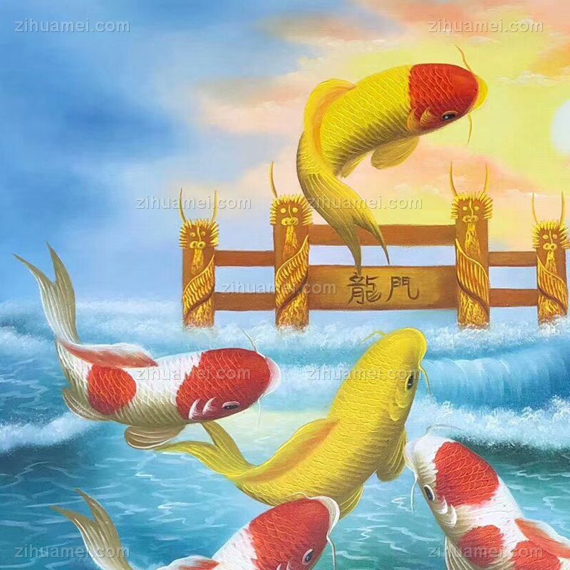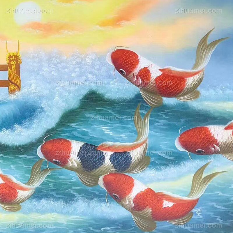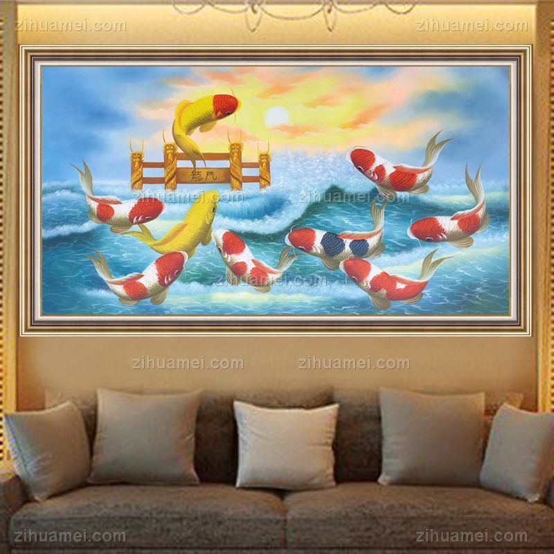 • Pure hand-painted nine fish picture lotus harmonious, happy, round and round Chinese oil painting family hanging painting living room hanging painting B