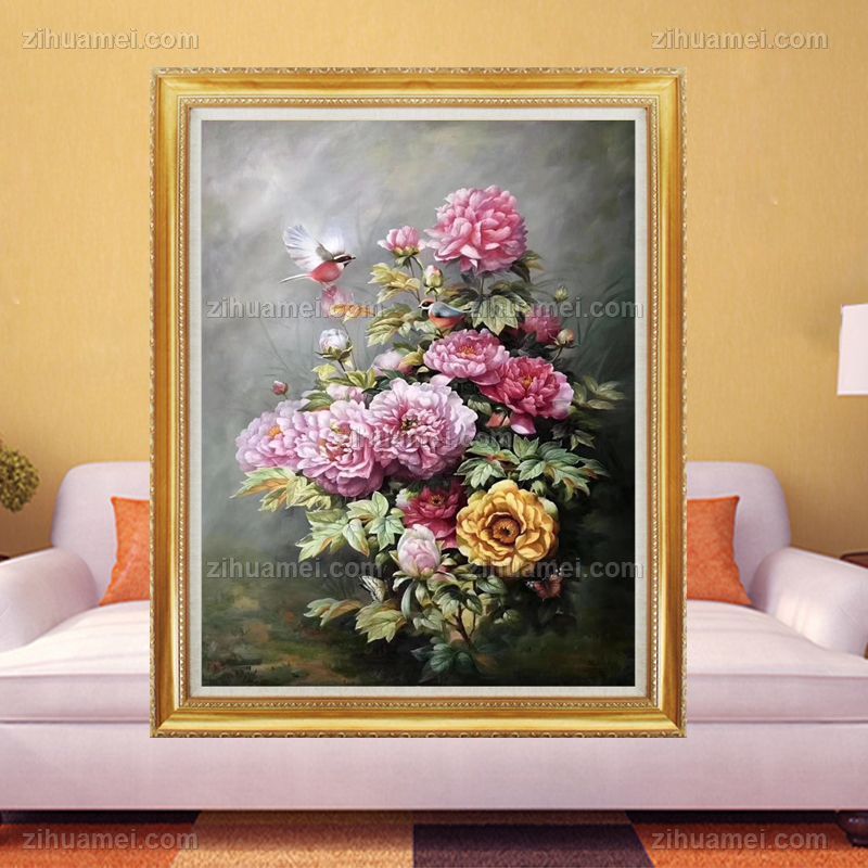• Flower and bird painting hand painted oil painting Peony painting oil painting boutique living room hanging solid wood frame flower blooming rich Chinese oil painting