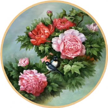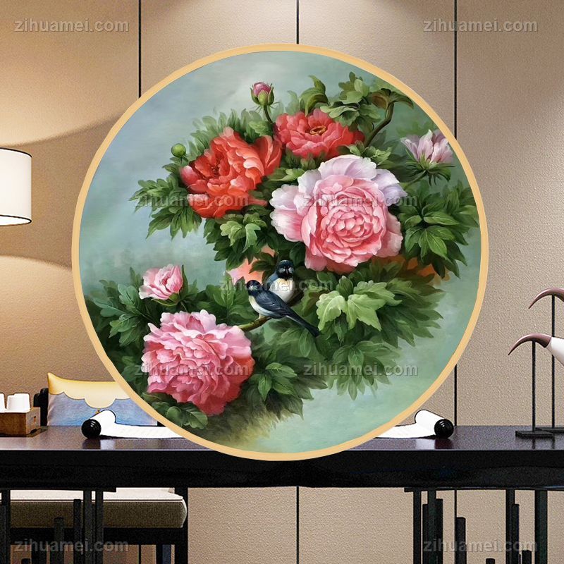 • Chinese Peony rich flower auspicious flower pure hand-painted oil painting works, especially suitable for Chinese family solid wood round frame