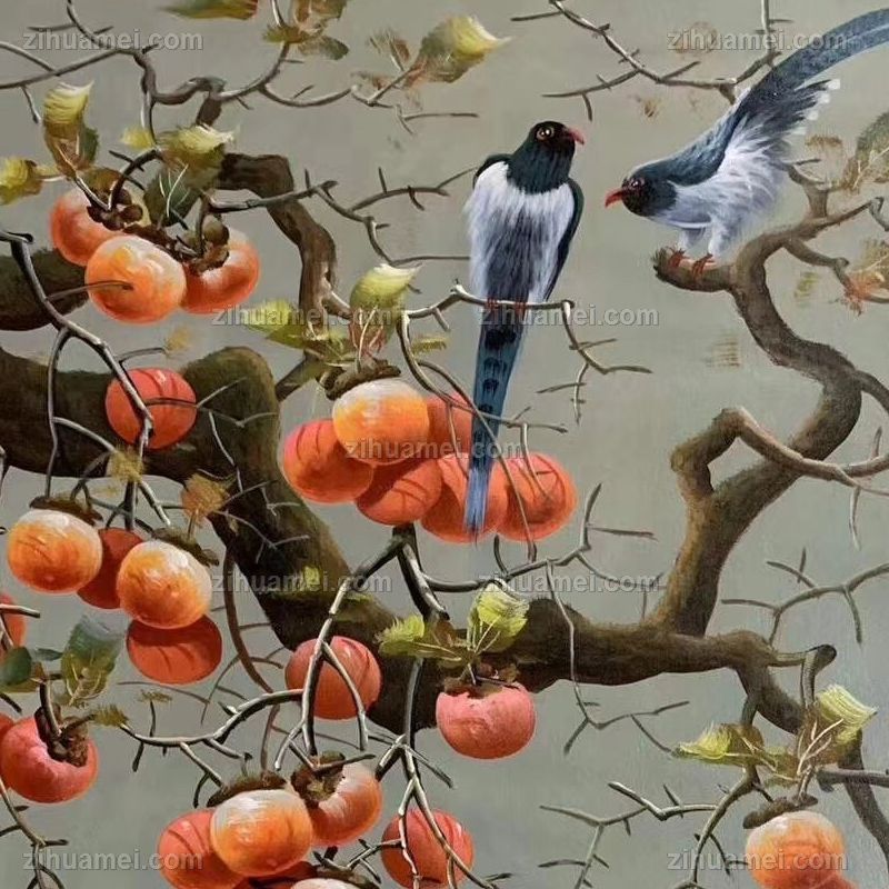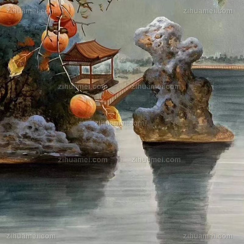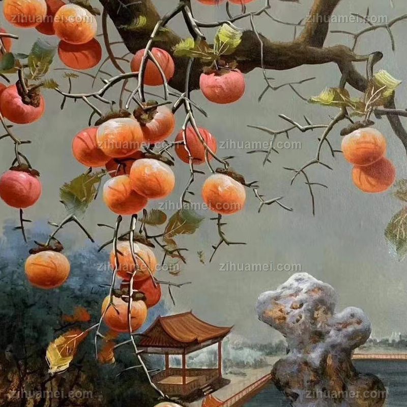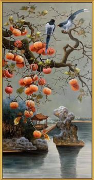 • New Chinese hand-painted oil painting pavilions, pavilions, ponds, persimmons and magpies are suitable for oil painting in living room and dining room