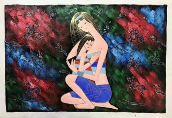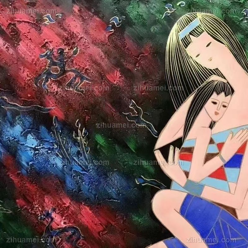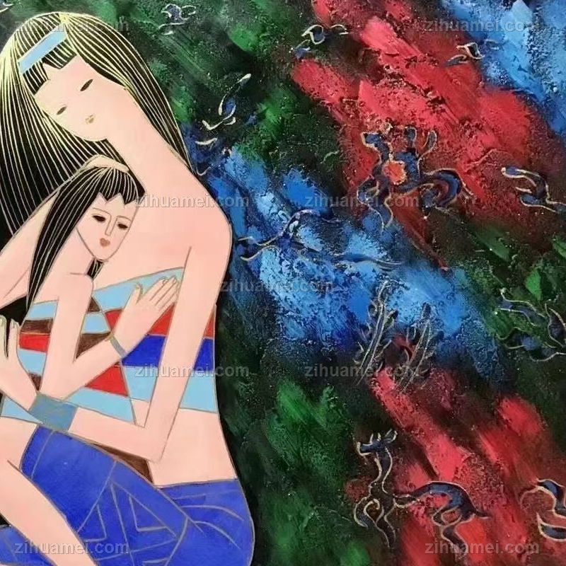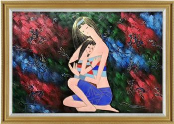 • Mother daughter deep love thick texture oil painting freehand original hand painted ethnic customs hand painted figure oil painting