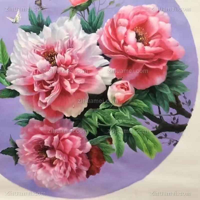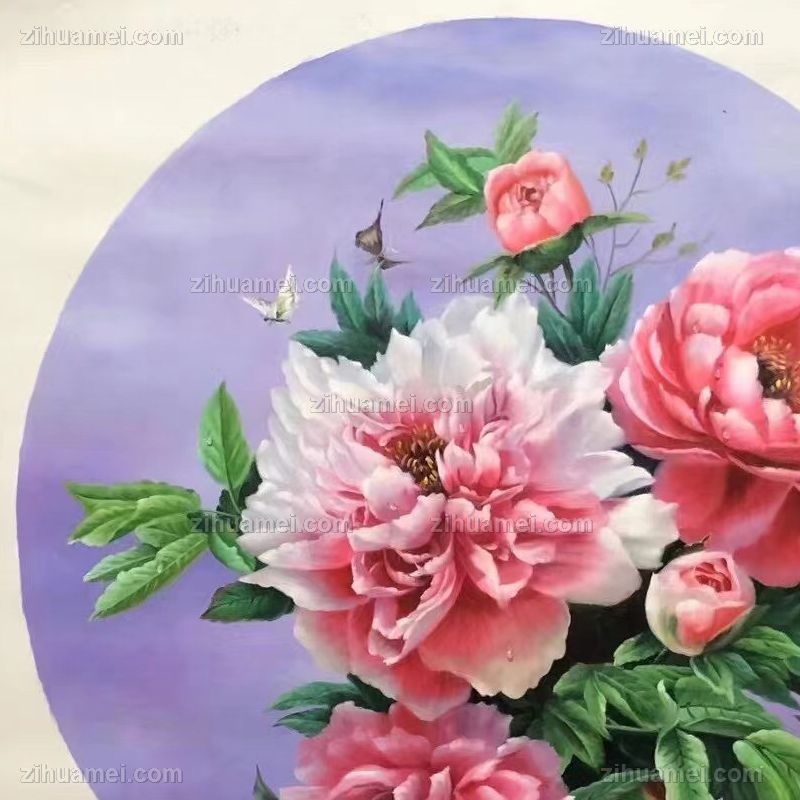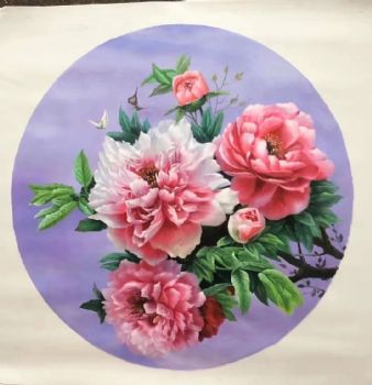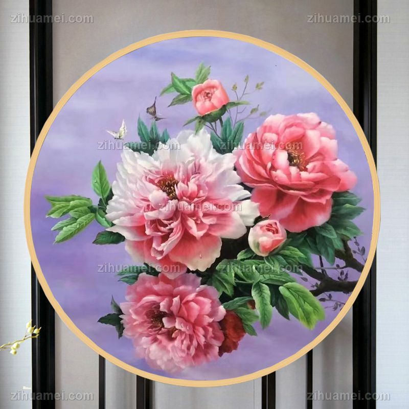 • New Chinese style rich and auspicious flower king peony oil painting pure hand painted solid wood round outer frame Xuanguan flower oil painting hanging painting