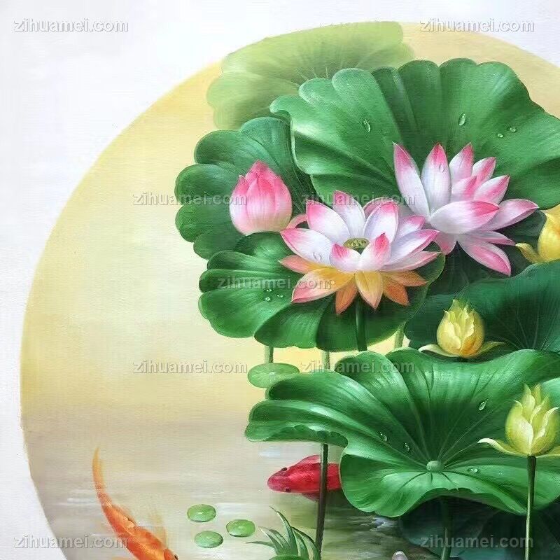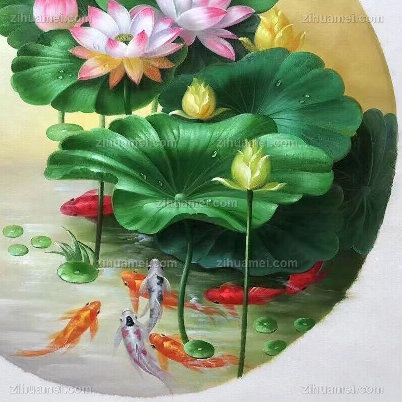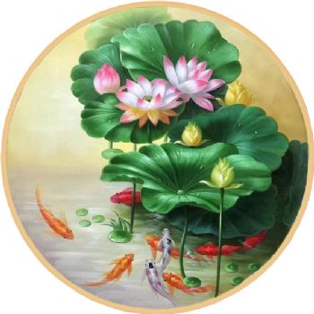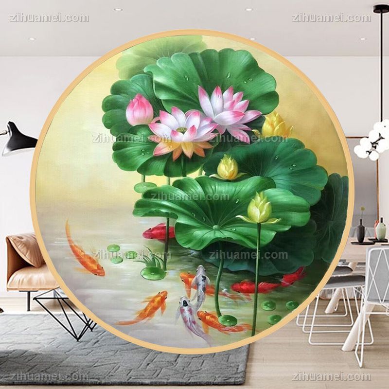 • Nine fish picture new Chinese lotus pure hand-painted flower oil painting means more than every year, harmonious and happy solid wood round frame