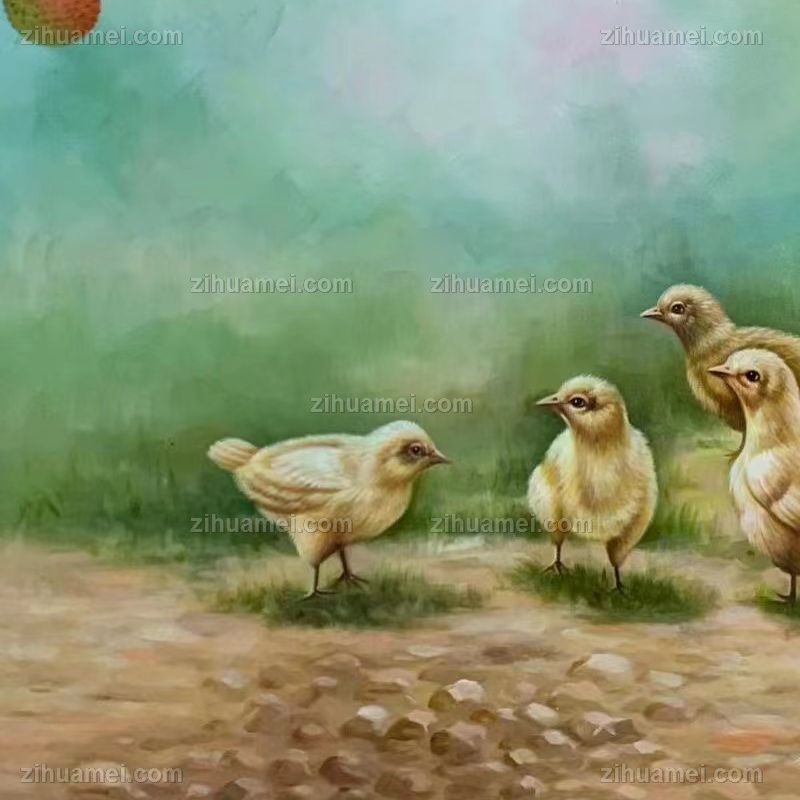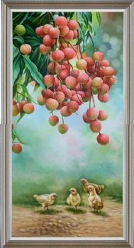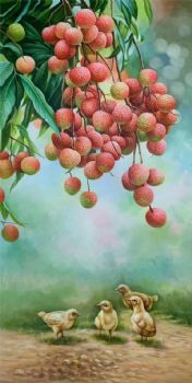 纯手绘新中式静物写实荔枝与小鸡仔动物油画