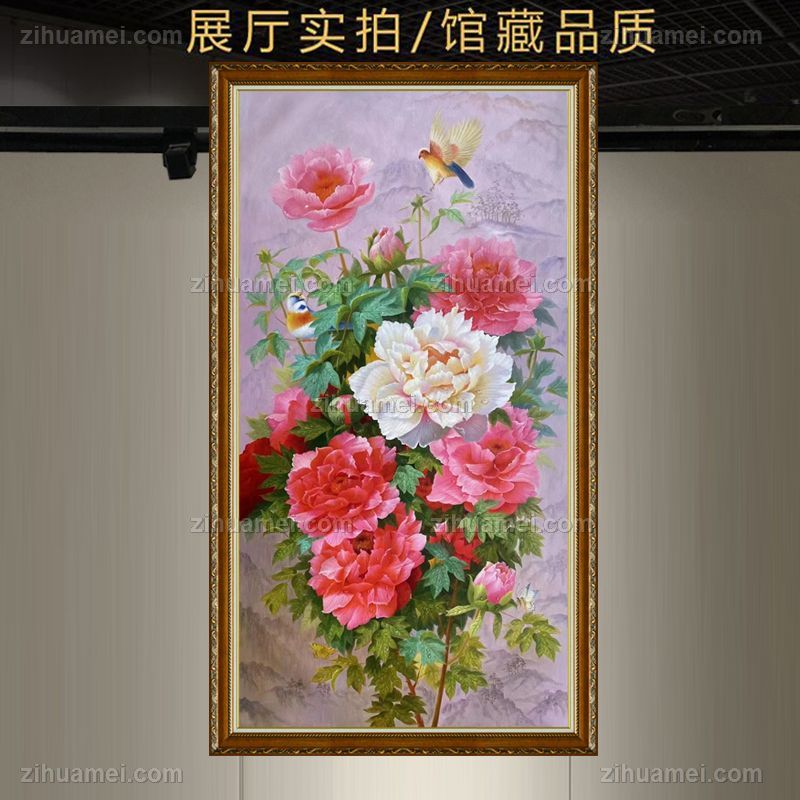 纯手绘花鸟油画牡丹油画玄关画