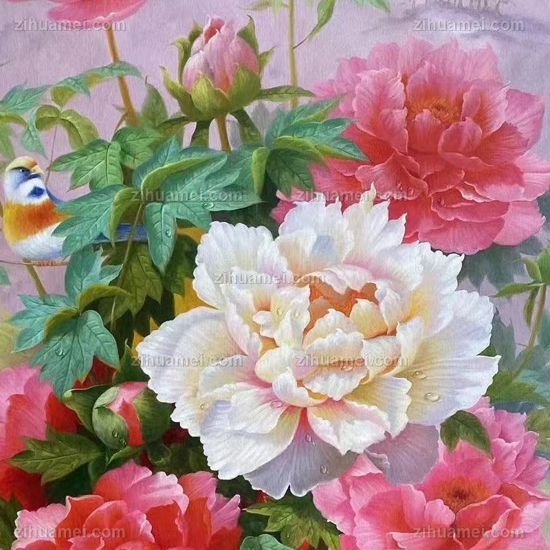 • New Chinese style hand-painted oil painting, flower and bird painting, peony painting, flower blooming, rich and noble porch, solid wood painting frame
