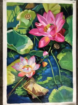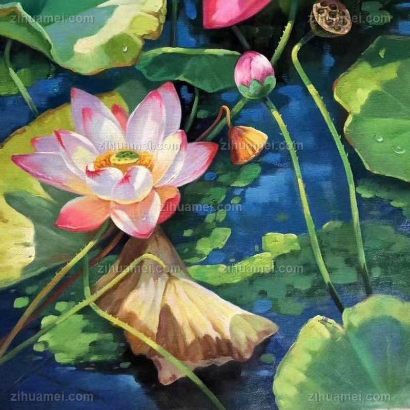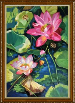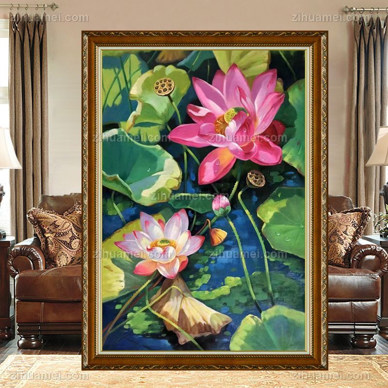 • Restaurant New Chinese Flower Oil Painting Pure Hand Painted Lotus Pond Landscape Oil Painting Solid Wood Frame