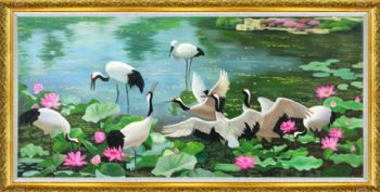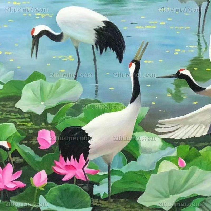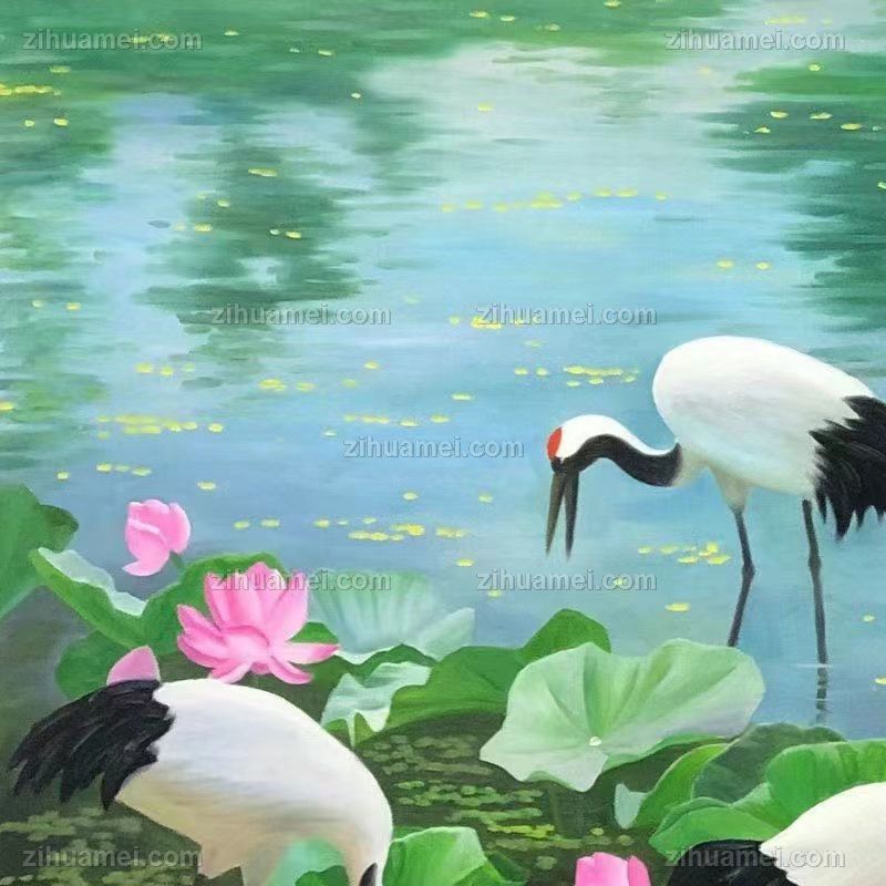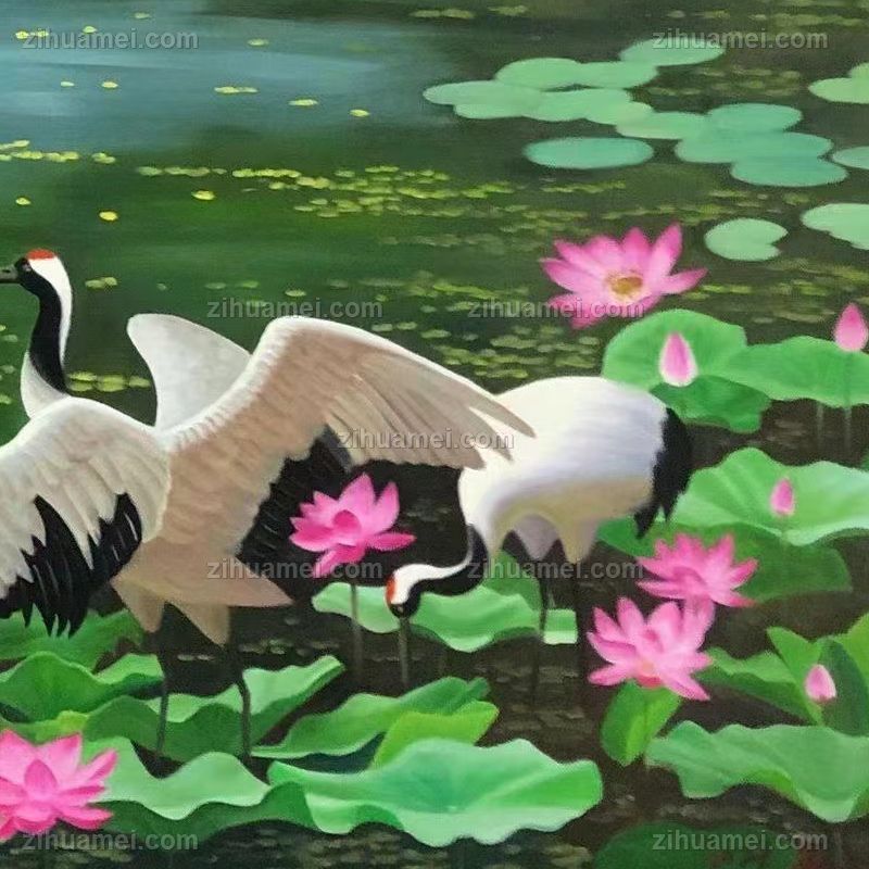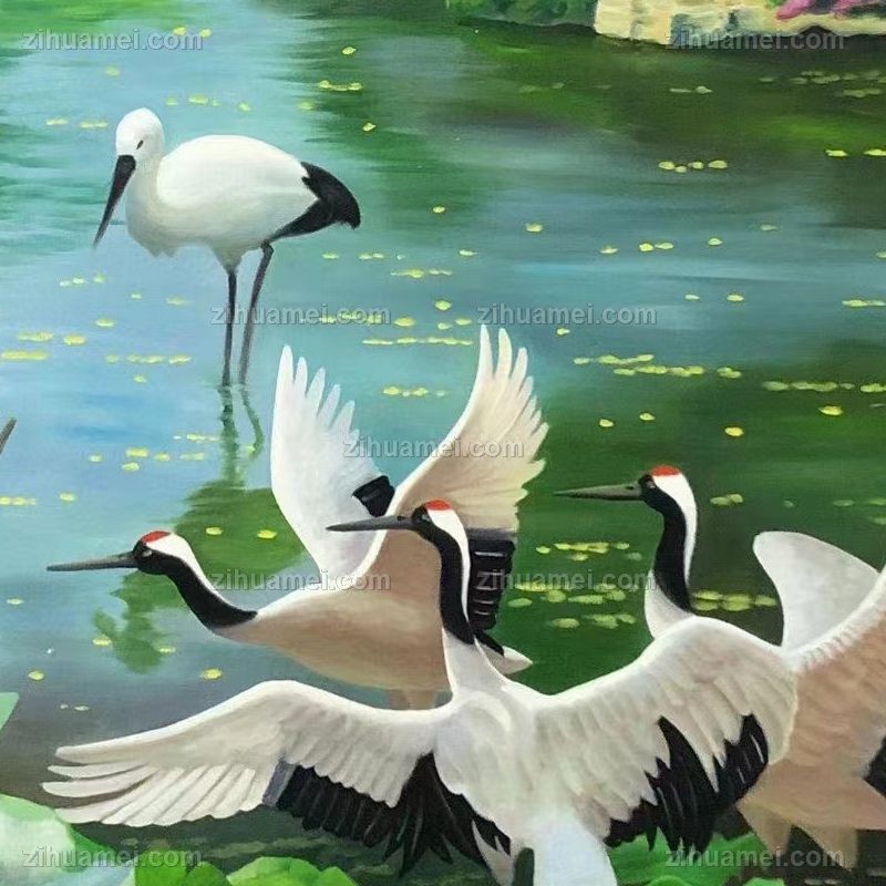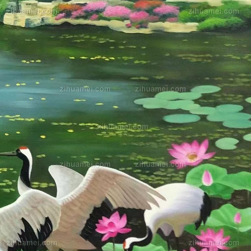 纯手绘风景油画仙鹤荷花池风景油画
