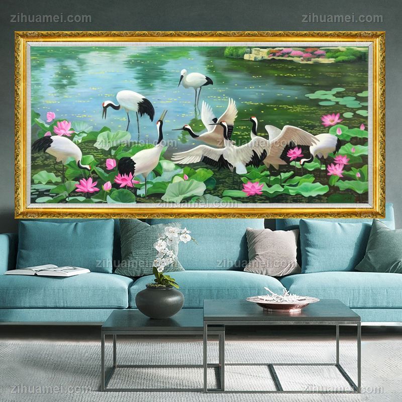 • Crane and Lotus Pond Landscape Oil Painting, Pure Hand Drawing, New Chinese Style Living Room Hanging Painting, Solid Wood Frame