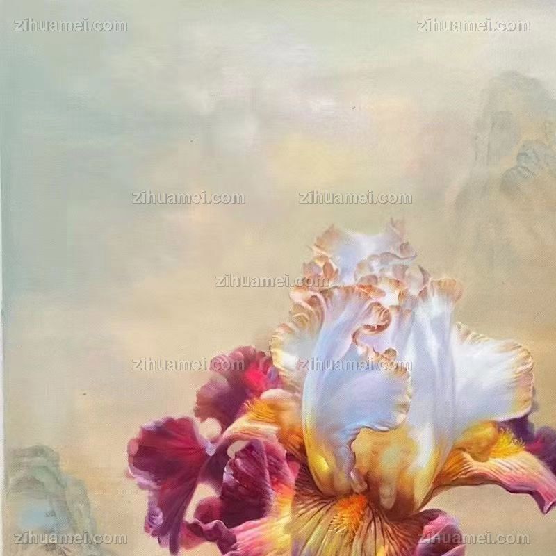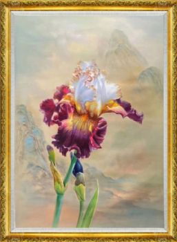 • A high-quality hand-painted and realistic flower oil painting with a rainbow tail flower in the mountains, solid wood frame