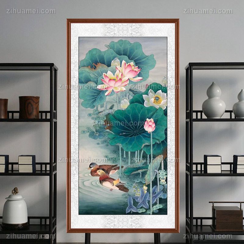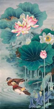 • Pure hand-painted meticulous traditional Chinese painting of lotus flowers and mandarin ducks