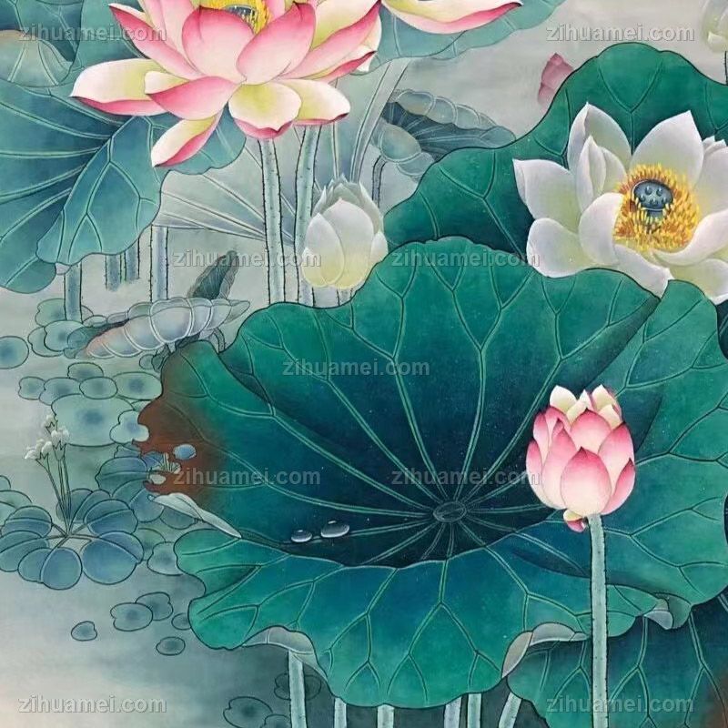 纯手绘工笔国画荷花鸳鸯图