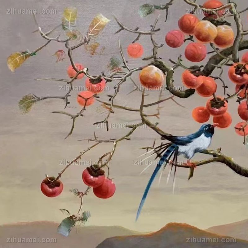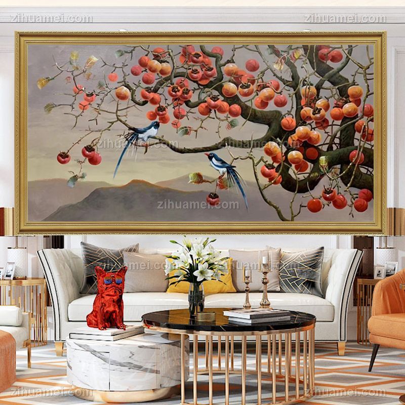 • New Chinese style hall persimmon painting, pure hand-painted oil painting, realistic flower and bird oil painting, solid wood frame