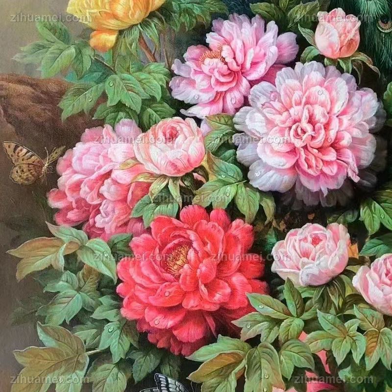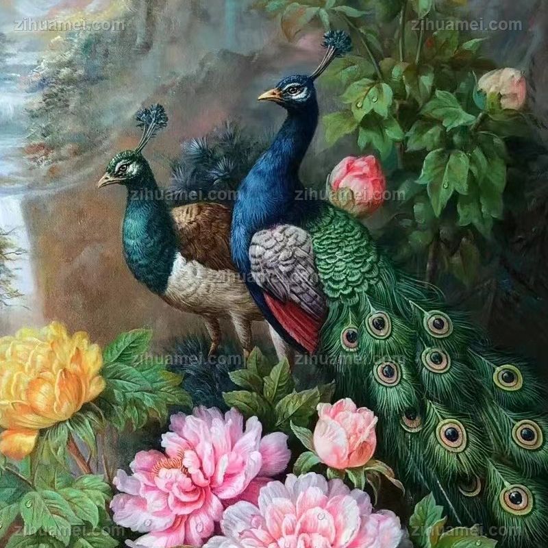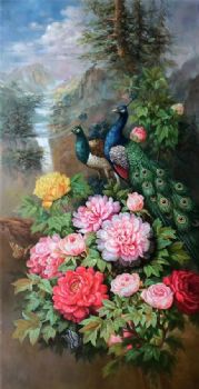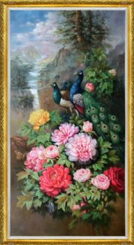 • High quality hand-painted flower and bird oil painting, peony, peacock, porch hanging painting, flower blooming, wealth, happiness, and auspiciousness