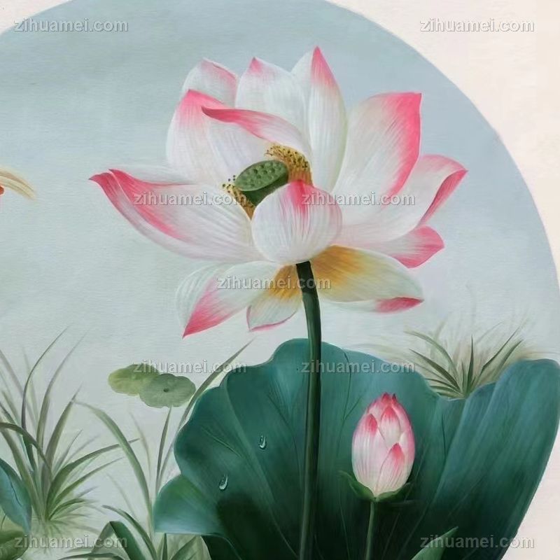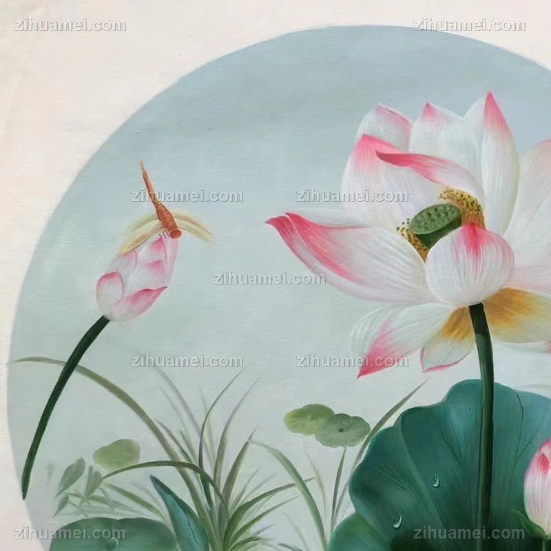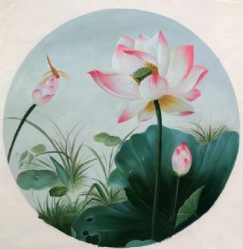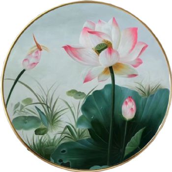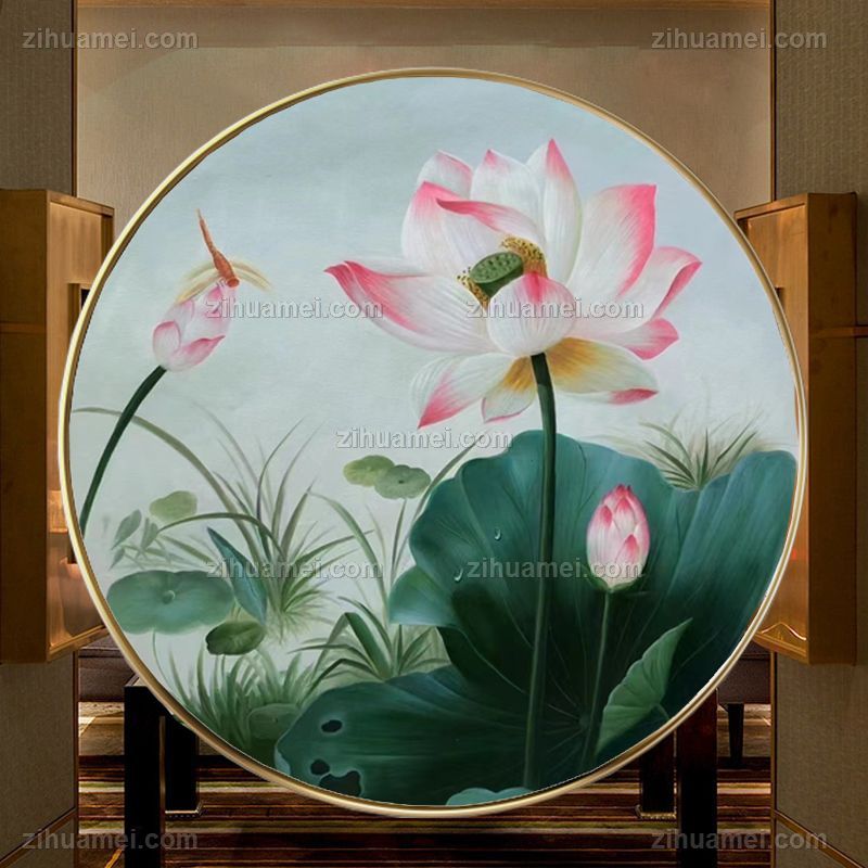 • Pure hand-painted circular flower and bird oil painting, lotus pond landscape oil painting, circular aluminum alloy outer frame