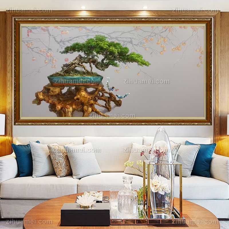 • New Chinese style living room pure hand-painted oil painting, green branch bonsai landscape oil painting, base leaf long youth longevity solid wood frame