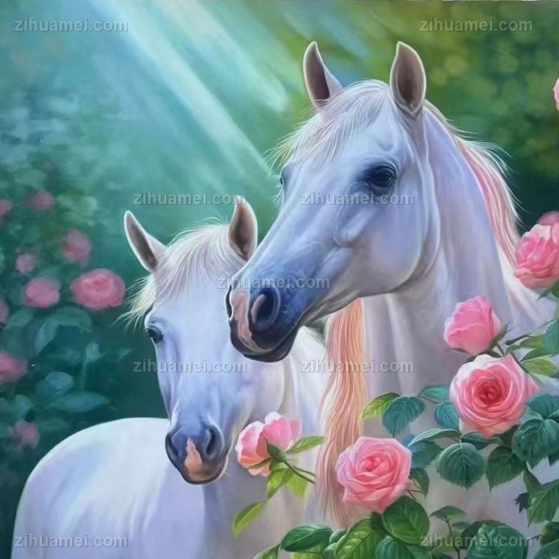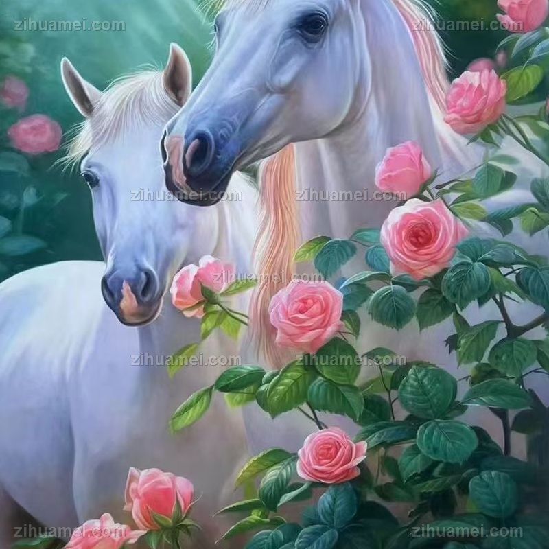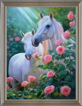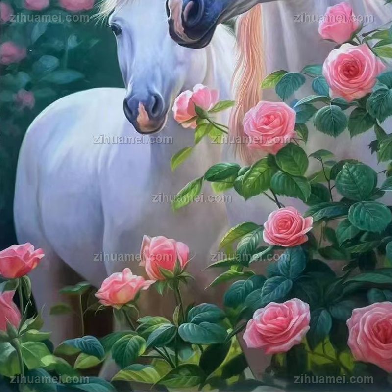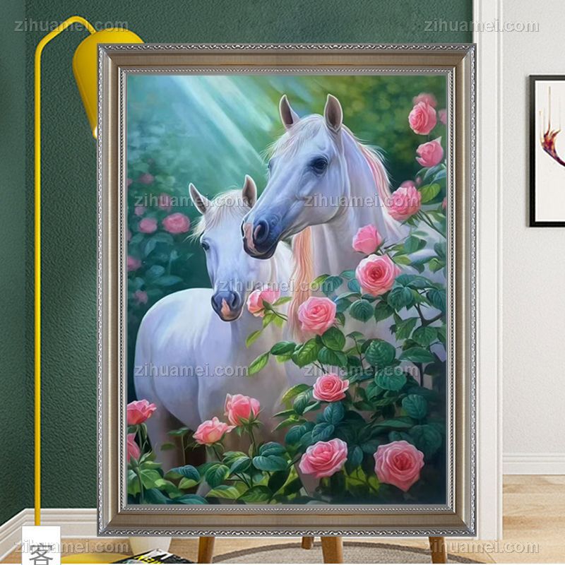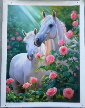• Fine flower white horse painting, pure hand drawn realistic animal oil painting, solid wood frame