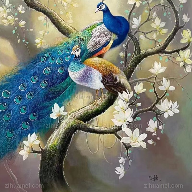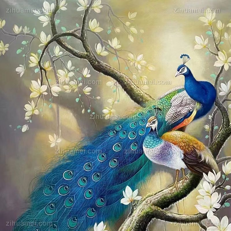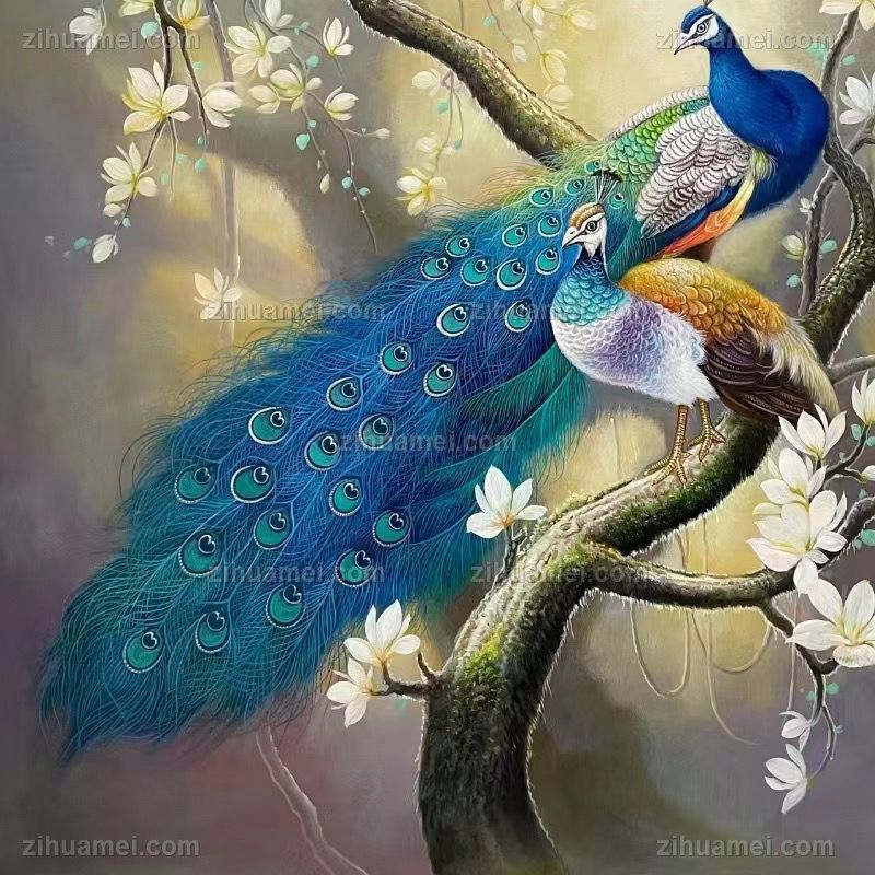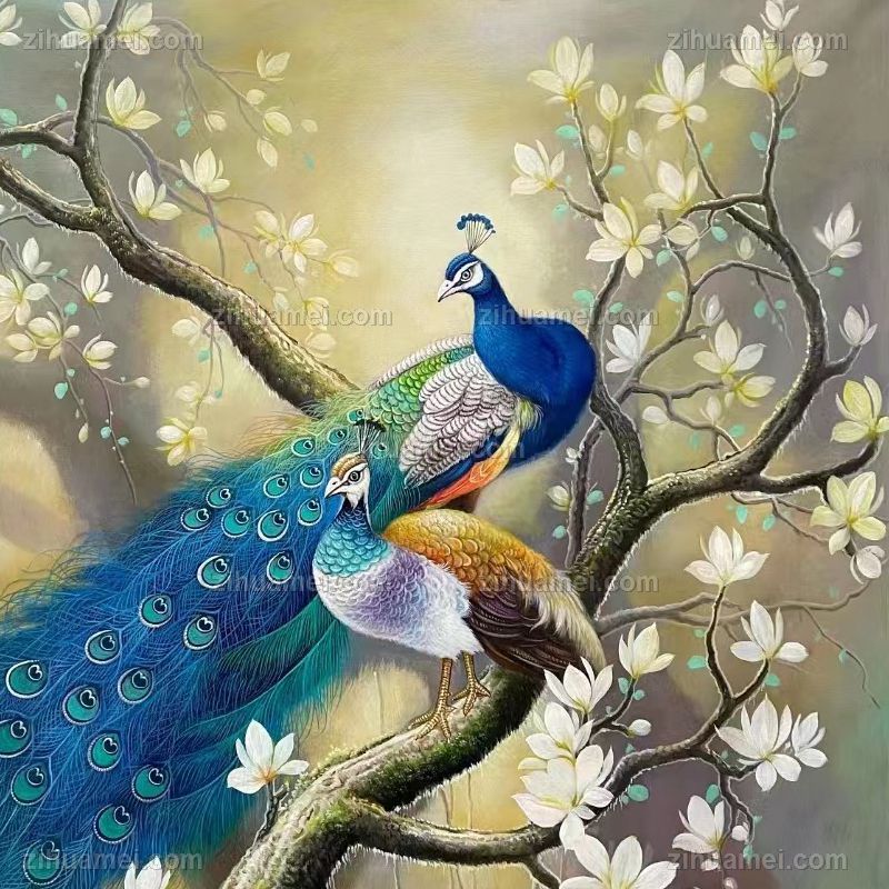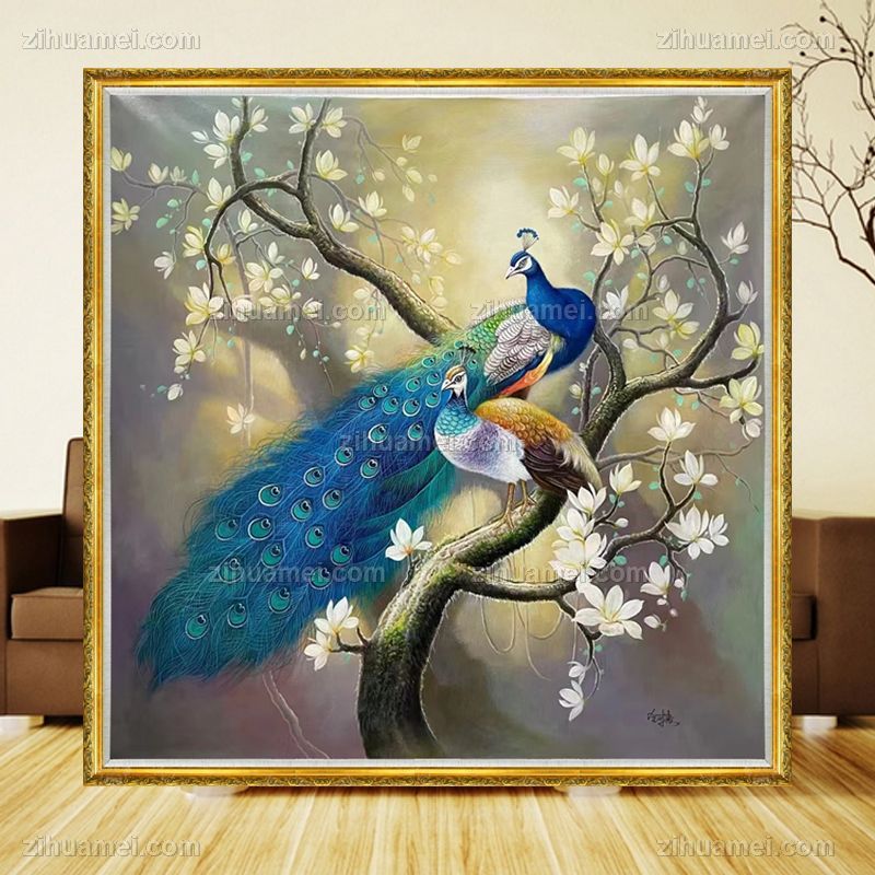 客厅大厅孔雀玉兰花油画作品