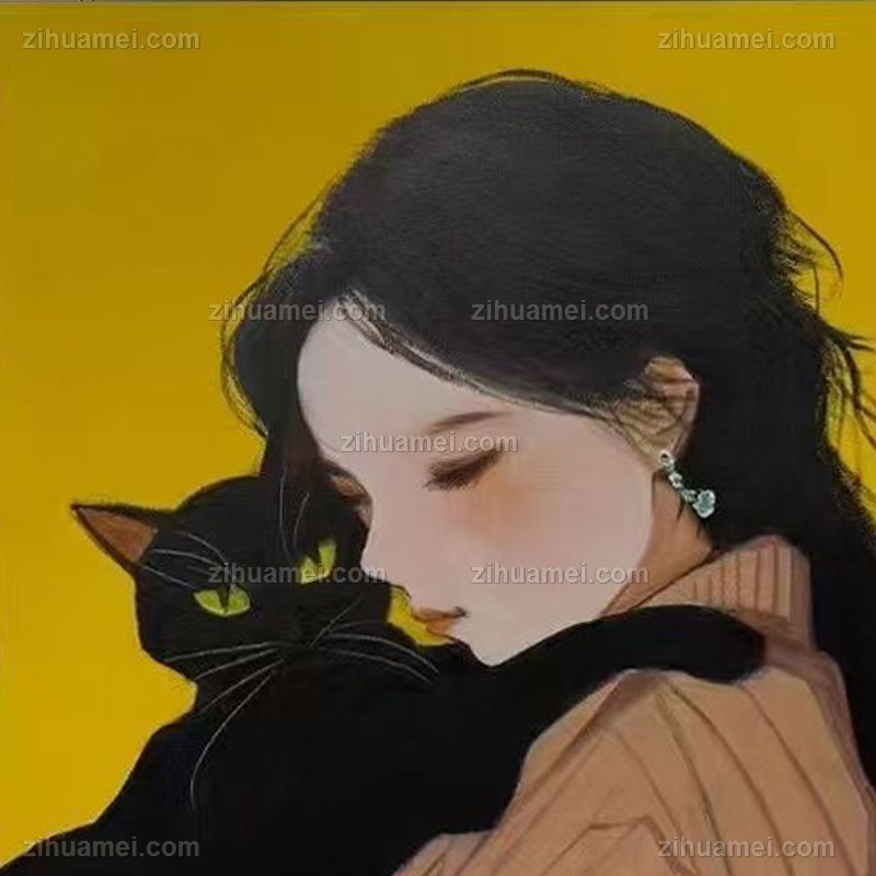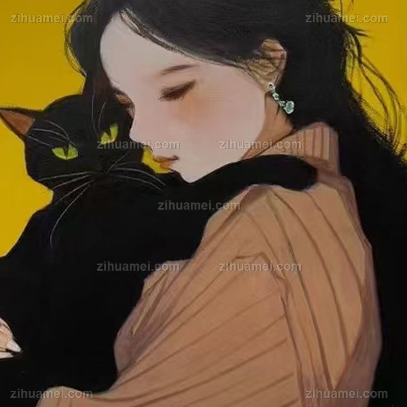 • Hand drawn portrait oil painting of a girl holding a black cat, children's bedroom oil painting