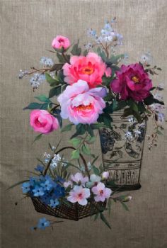 • New Chinese style flower oil painting works, pure hand drawn, handmade, oil painting of blooming flowers, wealth and prosperity, solid wood frame